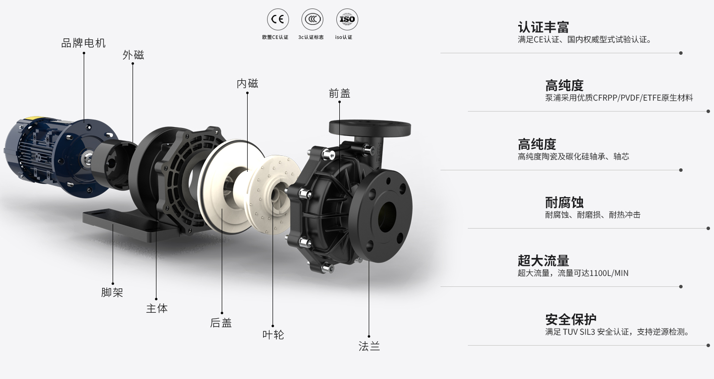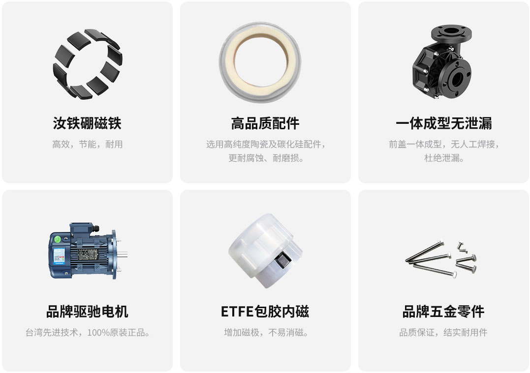 耐強腐蝕;采用釹鐵硼高效強磁鐵不消磁;進出水口一體成型專利無泄漏;品種多、流量大、噪音低;壽命長達10年以上;高揚程、高流量,尺寸型號可定制節能環保,同類產品對比耗電低精選永磁磁鐵汝鐵硼,磁性能力加強