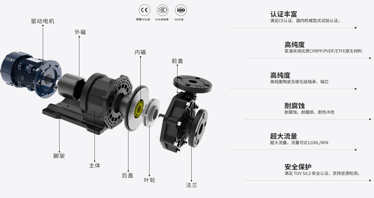 耐強腐蝕;采用釹鐵硼高效強磁鐵不消磁;進出水口一體成型專利無泄漏;品種多、流量大、噪音低;壽命長達10年以上;高揚程、高流量,尺寸型號可定制節能環保,同類產品對比耗電低精選永磁磁鐵汝鐵硼,磁性能力加強